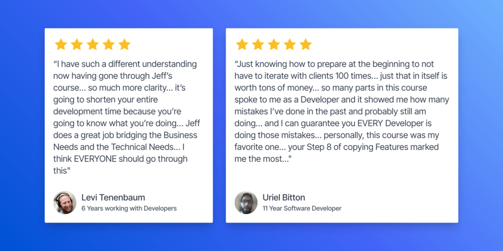 “'Am I building too much?’, ‘am I building the right thing?’, this course gives me a framework for how to answer those questions… I feel like it’s really easily digestible, but PACKED with so much info… this will allow me to have less iterations in order to get the same result… going through this course, I can see that Jeff has tons of industry experience and nobody could produce this quality if they haven’t been in the trenches for a long time… I’ve never seen a guide that’s this concise but adds so much value to this process… this course really helps you stay focused on delivering value and building the right thing the first time… this will save you $10,000’s maybe $100,000’s down the line… this will set you apart"