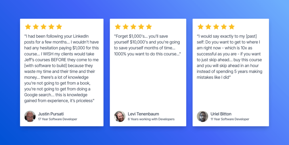 "I had been following your LinkedIn posts for a few months... I wouldn't have had any hesitation paying $1,000 for this course... I WISH my clients would take Jeff’s courses BEFORE they come to me [with software to build] because they waste my time and their time and their money… there’s a lot of knowledge you’re not going to get from a book, you’re not going to get from doing a Google search… this is knowledge gained from experience, it’s priceless"