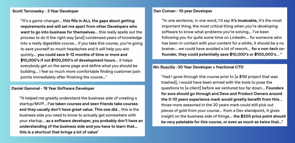 “It’s a game-changer… this fills in ALL the gaps about getting requirements and will set me apart from other Developers who want to go into business for themselves… this really spells out the process to do it the right way [and] condensed years of knowledge into a really digestible course… if you take this course, you’re going to save yourself so much headaches and it will help you win quickly… you could save 6-12 months of time or more and $10,000’s if not $100,000’s of development hours… it helps everybody get on the same page and define what you should be building… I feel so much more comfortable finding customer pain points immediately after finishing the course…"