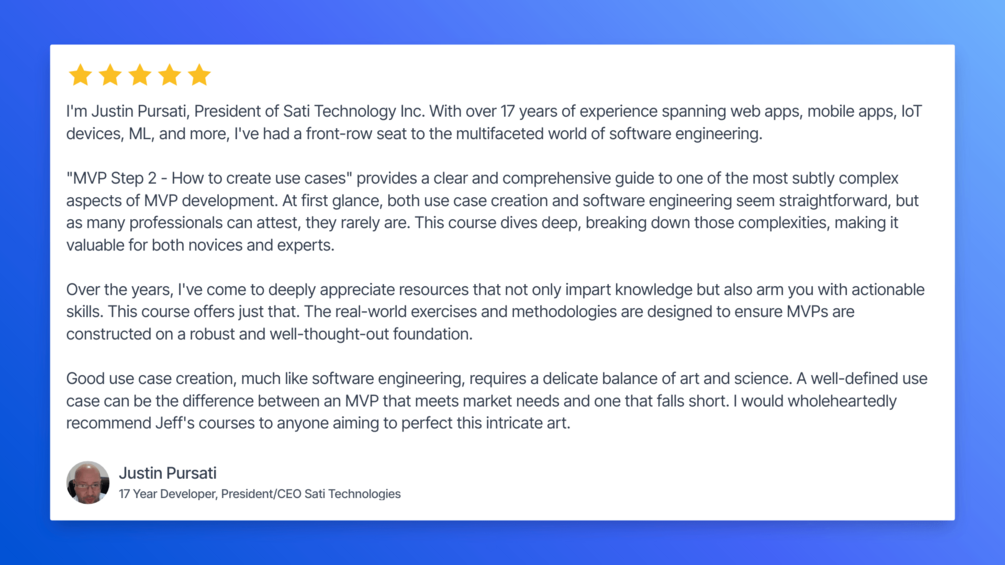 “This course gives you a framework to be able to clearly define use cases… I’m always a little skeptical of course sellers because you don’t really know their body of work and taking bad advice is sometimes worse than taking no advice at all… after just taking your first course, I could just tell that you’re the real deal and you know your stuff… just by the way you’re communicating I can just tell you have 1,000’s of hours of experience and that’s SO valuable… this course prepares you to truly dial in what you’re trying to build… it really forces you to simplify and manage expectations"
